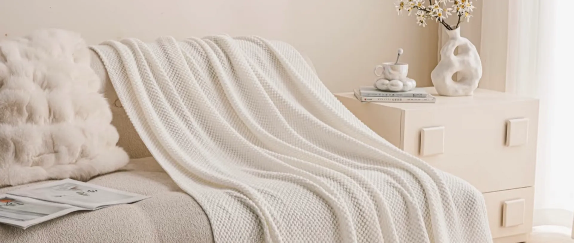 You can put it between the plain weave sheets and the thick quilt to add a layer of warmth; or I prefer the method: fold it neatly and spread it at the end of the bed. This can add a touch of texture contrast to the bed surface, which is often the source of what we call “high-level feeling.